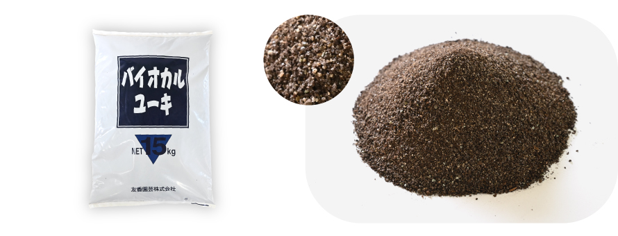 バイオカルユーキは、良質の腐植・有用微生物・三要素の他、ケイ酸・微量要素を含む芝生用総合栄養資材です。